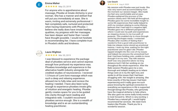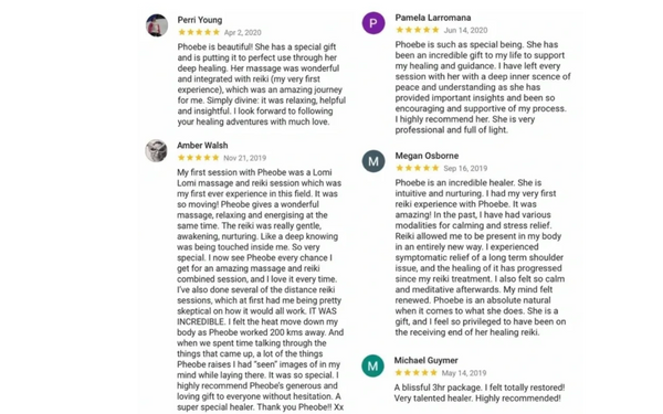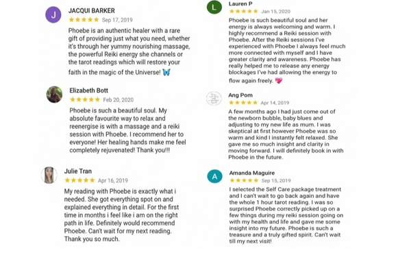 "I love Phoebe's compassionate and 100% loving energy work with Reiki (and her really helpful insights) and her massages are very deeply healing, restoring and balancing. I've had quite a few sessions with Phoebe and I always feel lighter, brighter and more connected to myself. Thanks so much Phoebe!" - Jesabe Warner