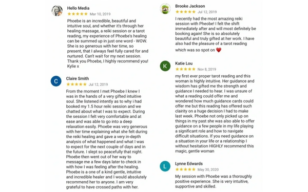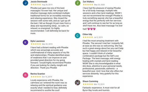 "Phoebe has the most loving and healing energy which just pours through all of her healing - massage, reiki, tarot - her massages are amazing! She is such a gentle intuitive soul, which only adds to her magical treatments." - Kerri Pietsch