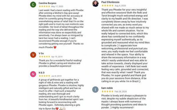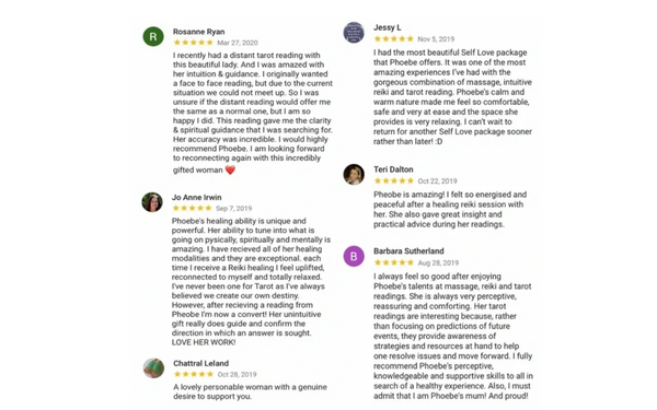 "I had a tarot reading with the beautiful Phoebe and I was very happy! It was professional, insightful and full of direction. I walked away feeling comforted and great!" - Jessica Byrne