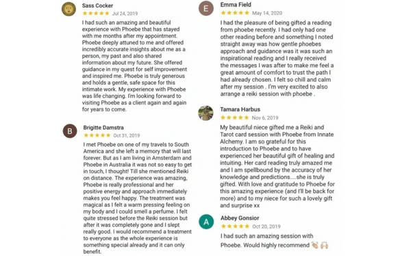 "Reiki & tarot sessions with Phoebe are a genuine, heartfelt & guided experience. She is divine." - Isabel Supiani